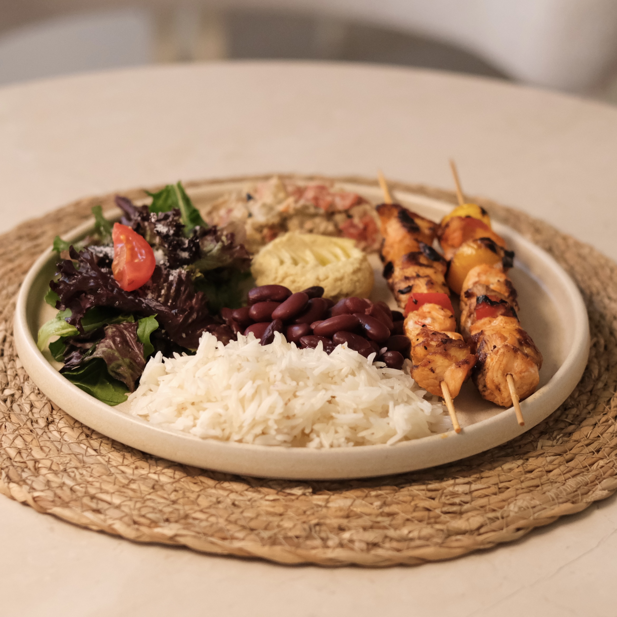 2 Adet tavuk şiş (100gr), basmati pirinç (100gr), meksika fasulyesi, mevsim salata, humus, babagannuş