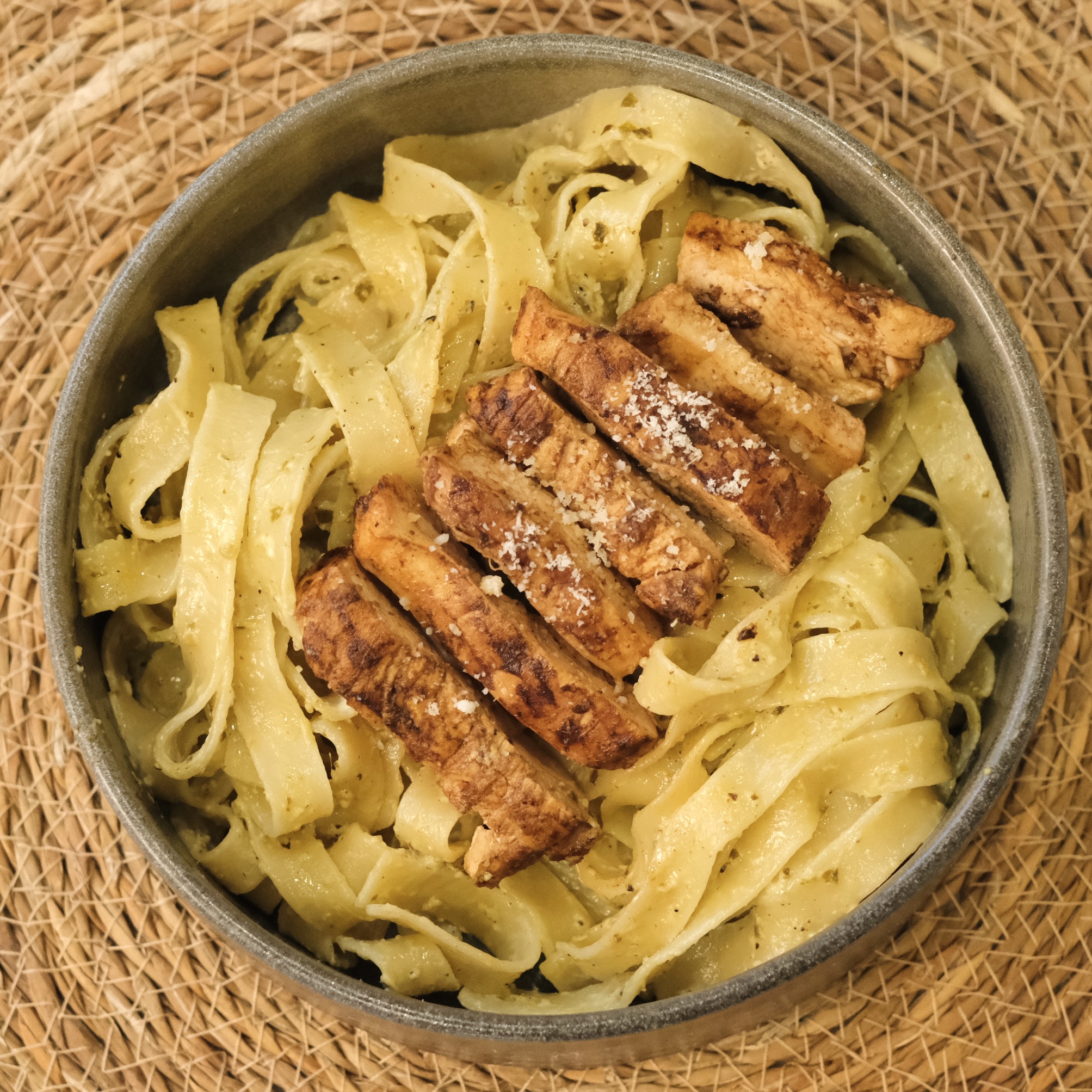 Izgara Tavuk(130gr),Fettuccini makarna(150 gr), Krema,Pesto sos,Parmesan peyniri