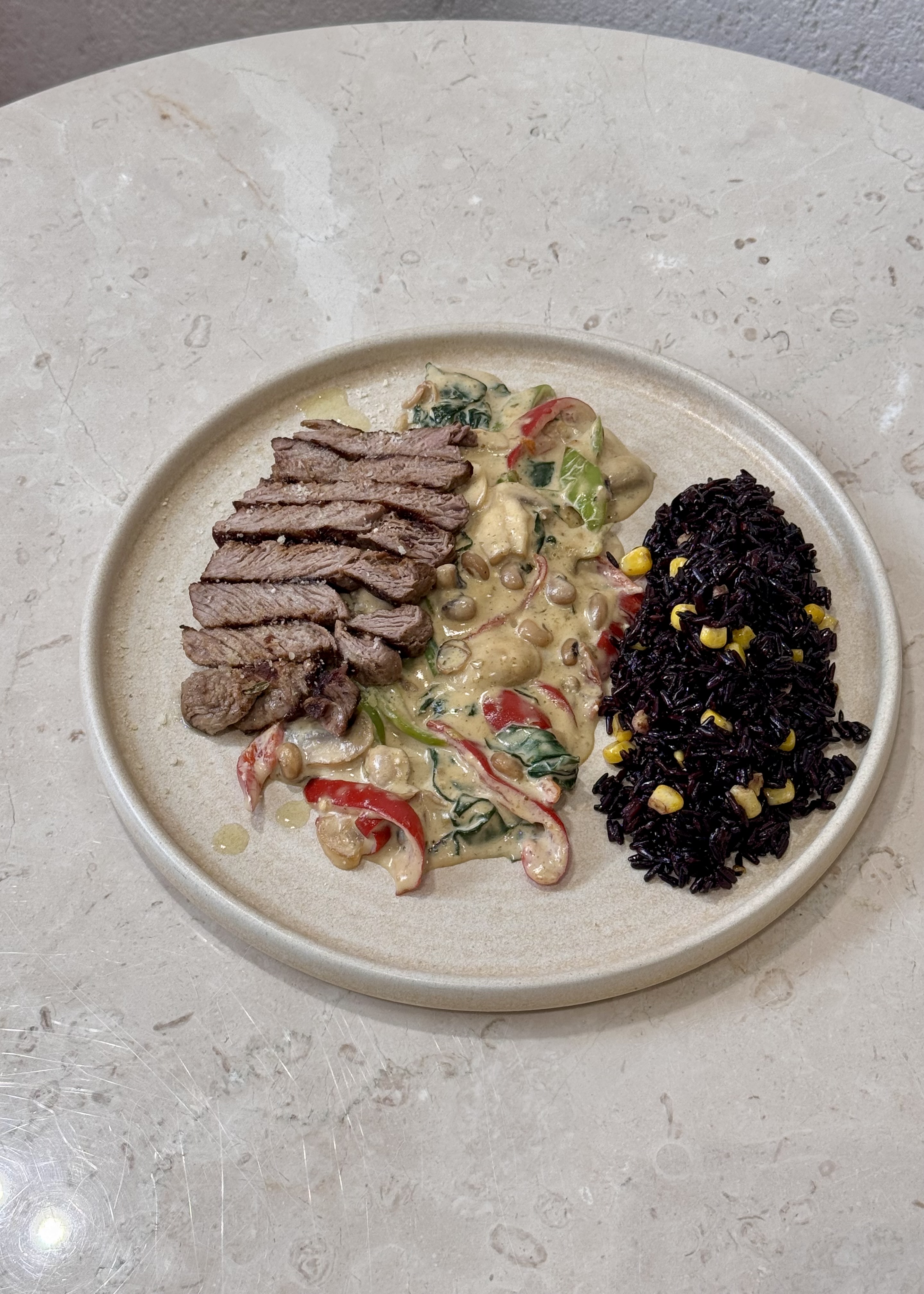 Kremalı sebze sote, mısırlı esmer pirinç, 130 gr bonfile dilimleri
