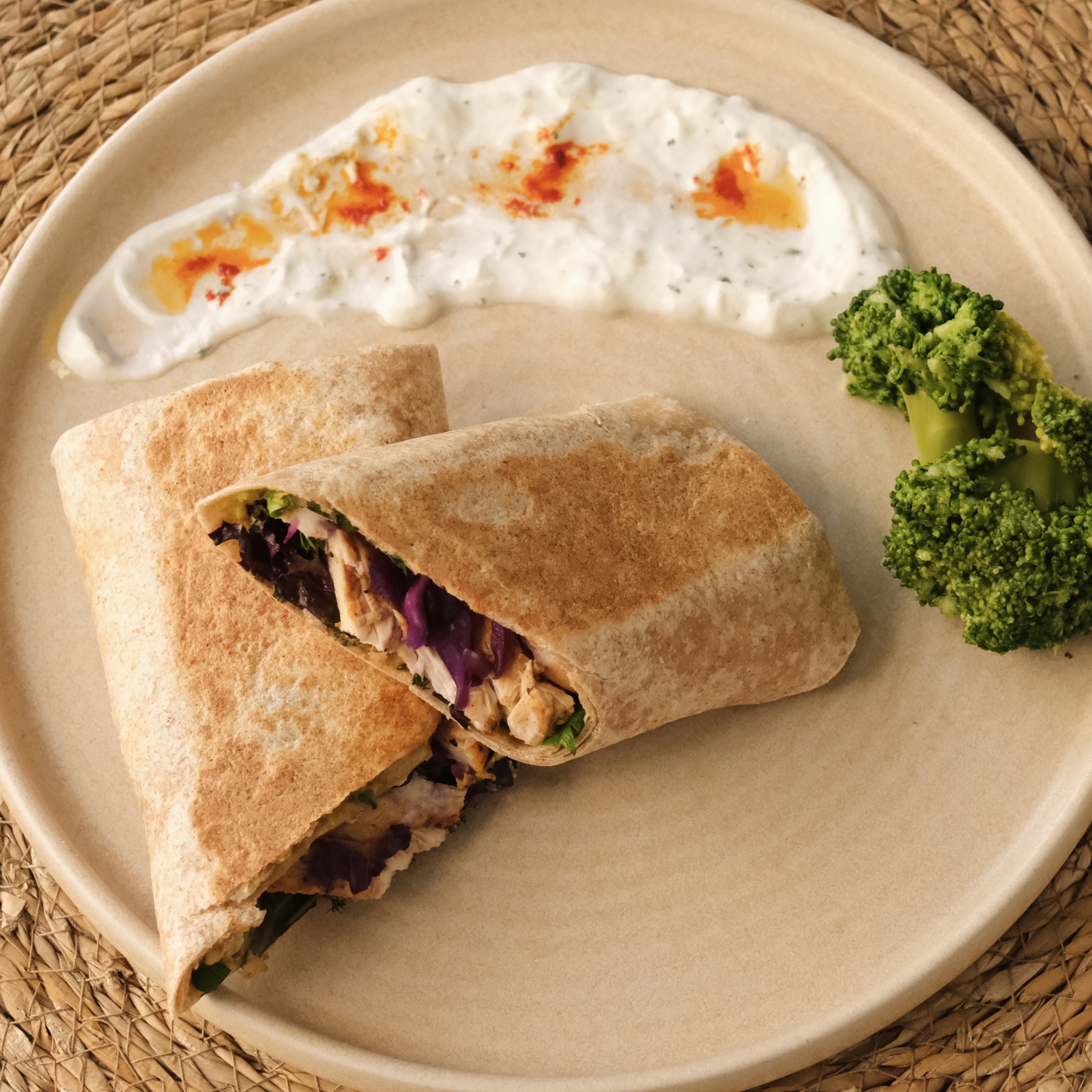 Jülyen doğranmış tavuk (100g), avokado ezmesi, mor lahana, yoğurtlu sos