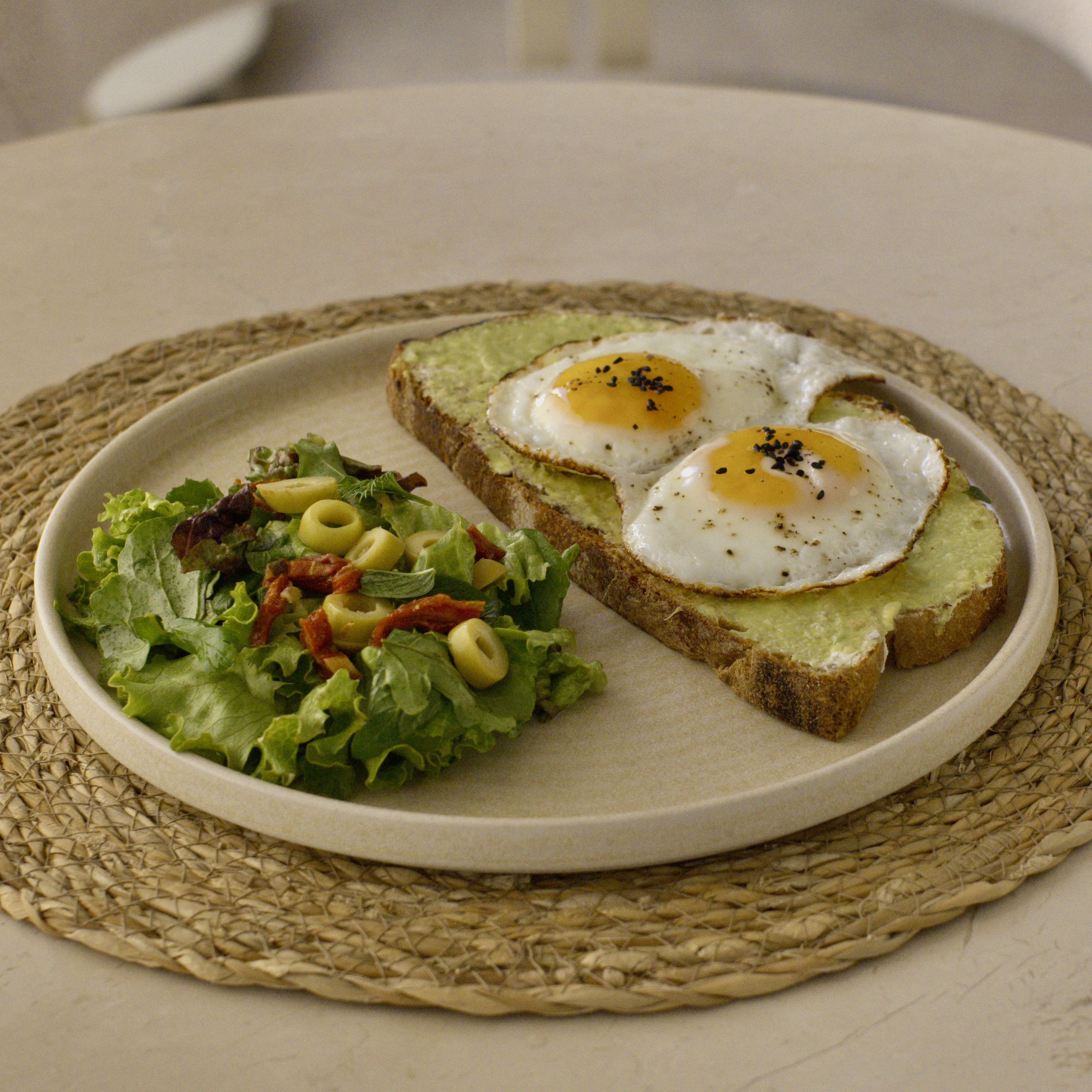 Ekşi mayalı ekmek, labne, avokado ezmesi, göz yumurta (2 adet), mevsim salata( dilimlenmiş zeytin ve kuru domates ile)