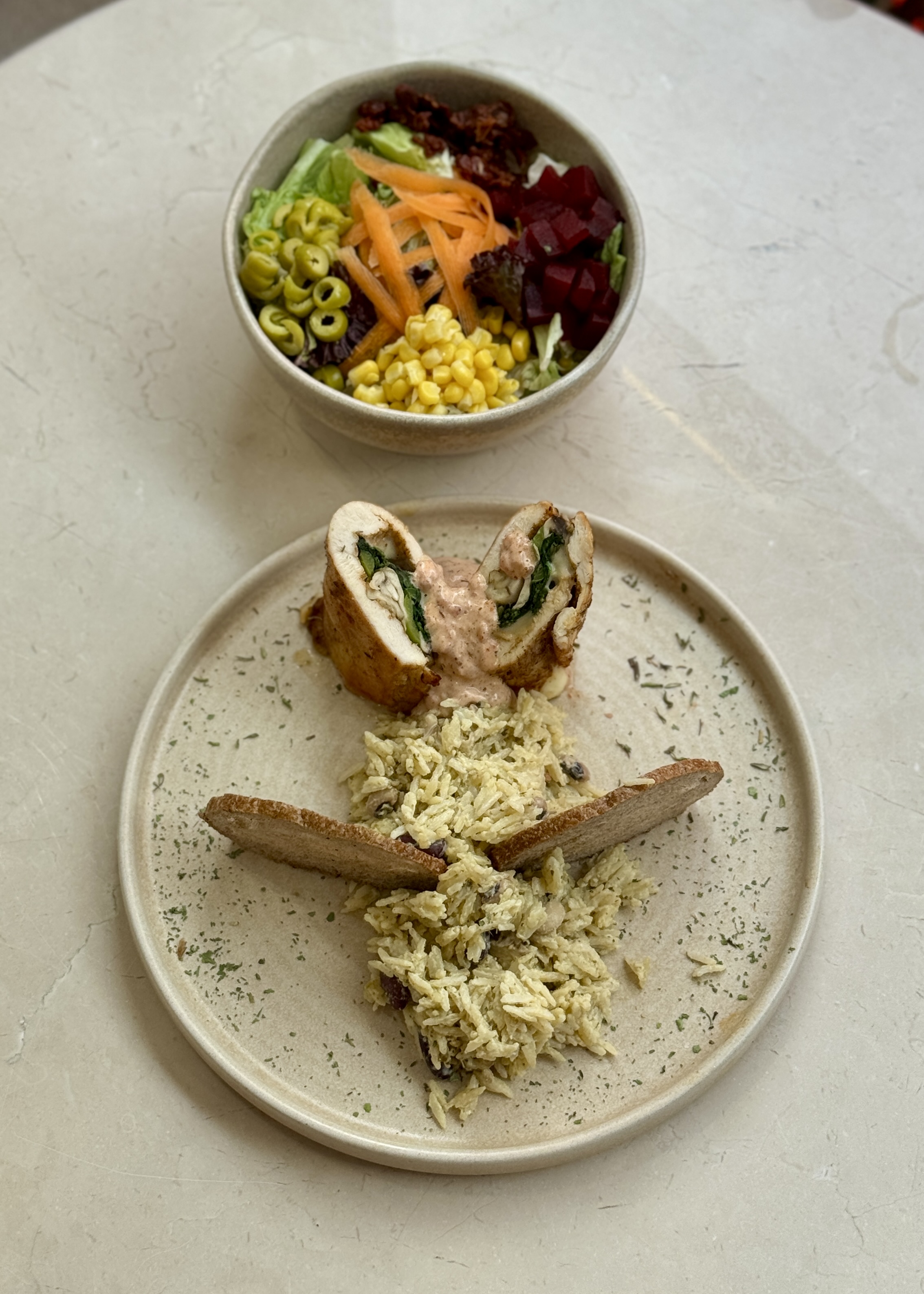 İçi ıspanak tavuk rulo, pesto soslu basmati ve çilek sos