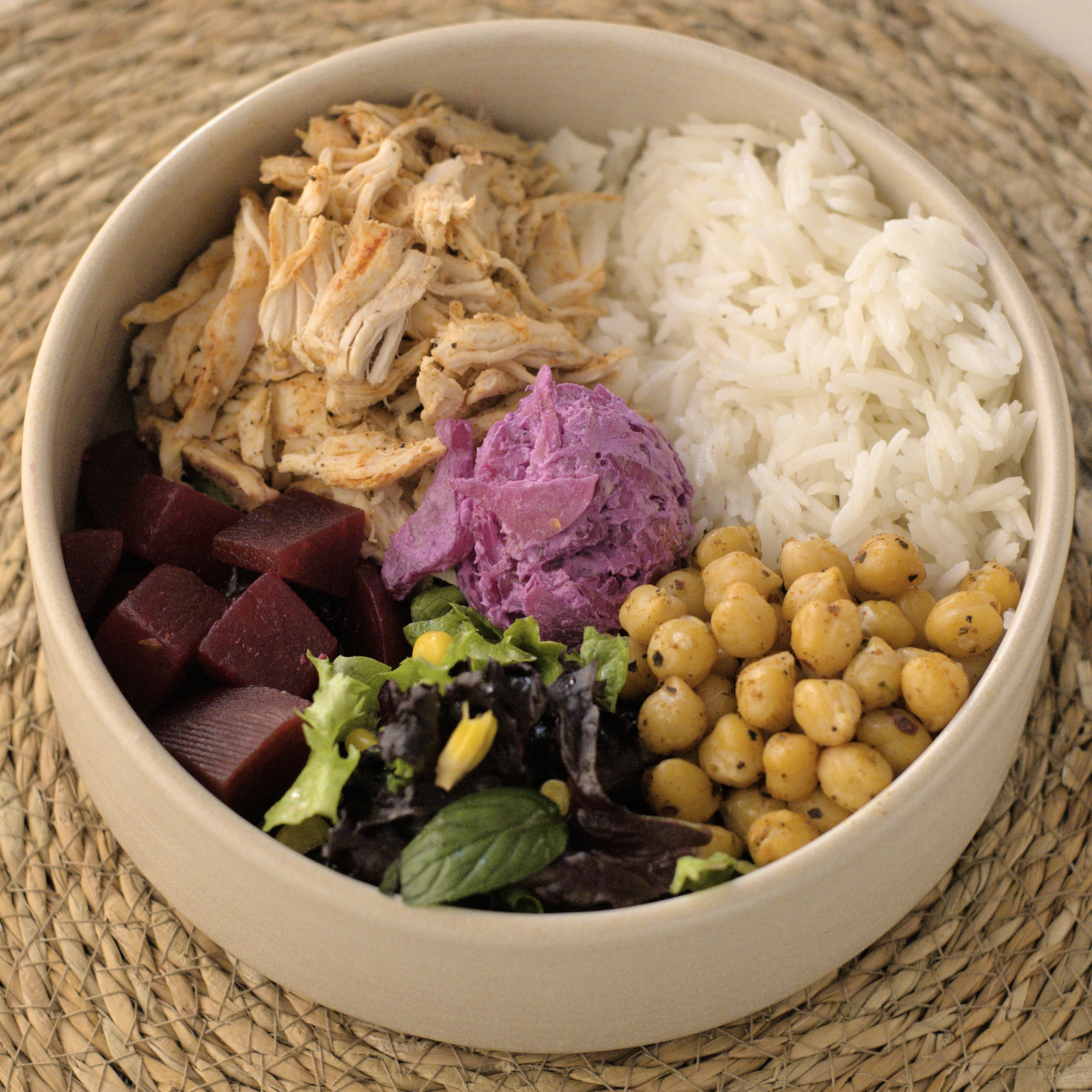 Tiftiklenmiş tavuk (150g), basmati pirinç (100g), fırınlanmış baharatlı nohut, mor lahana mezesi, mevsim salata, haşlanmış pancar