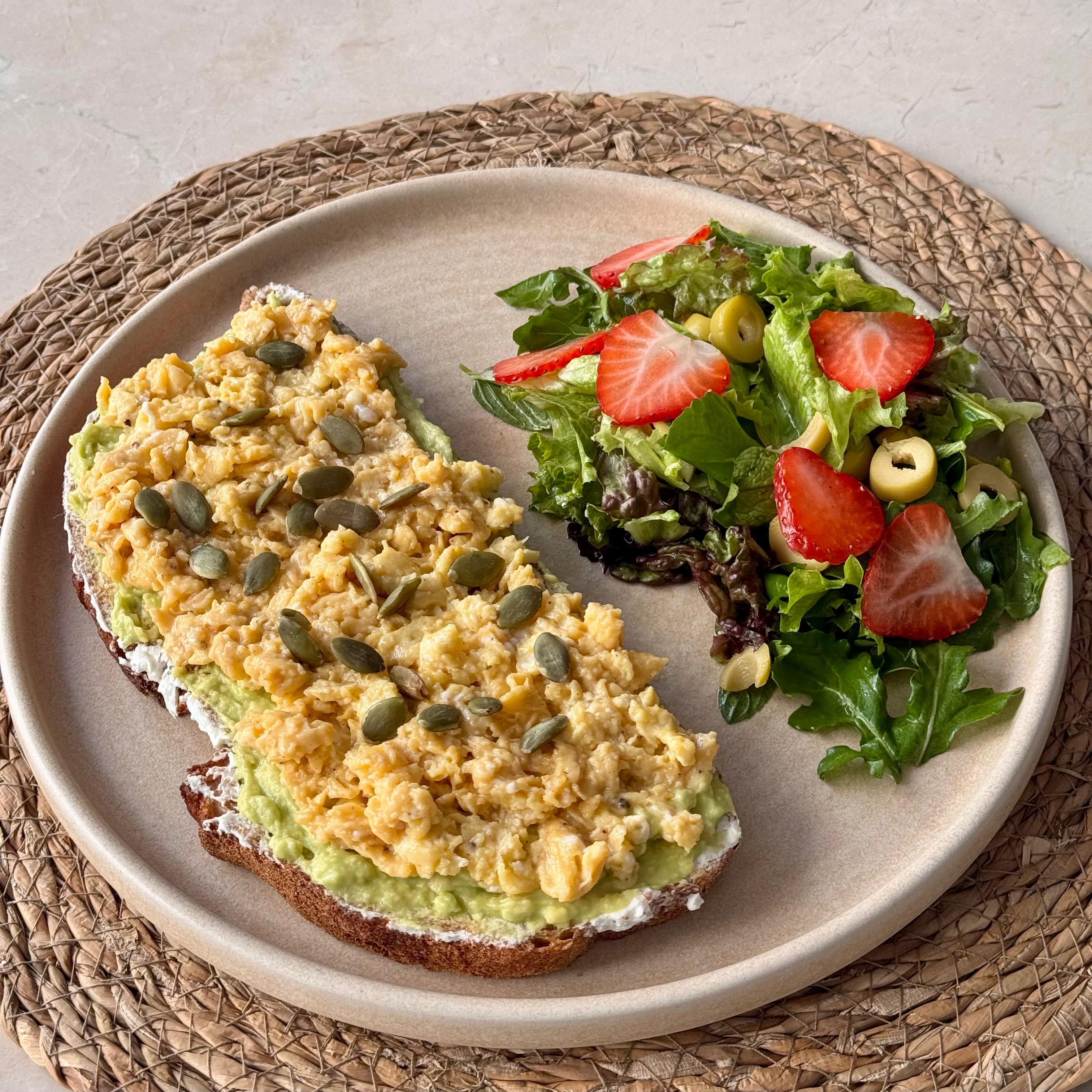 Ekşi mayalı ekmek, labne, avokado ezmesi, çırpılmış yumurta (3 adet), mevsim yeşillikleri ve dilimlenmiş yeşil zeytin