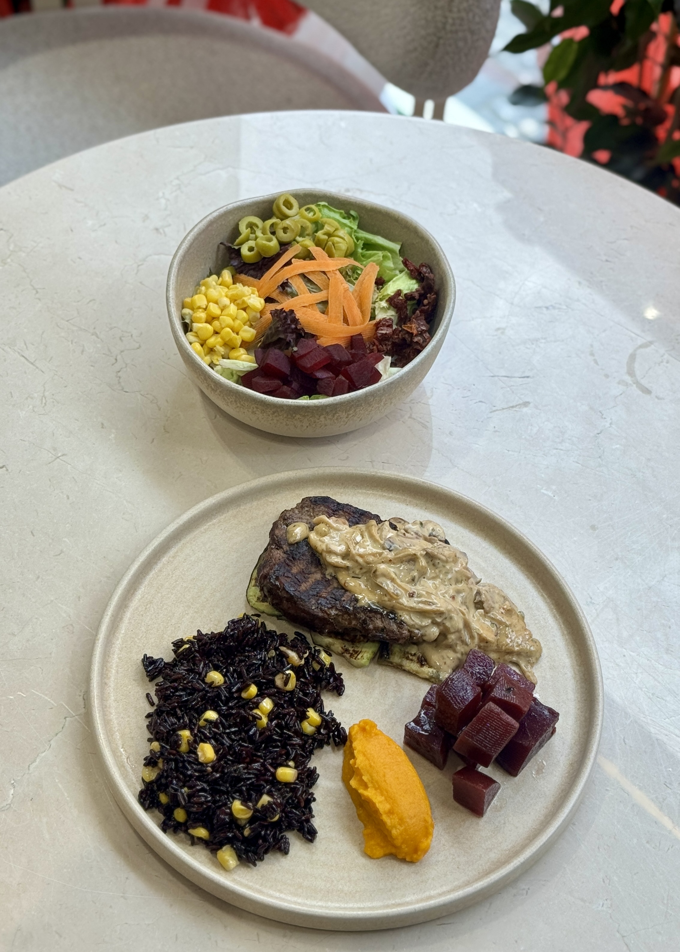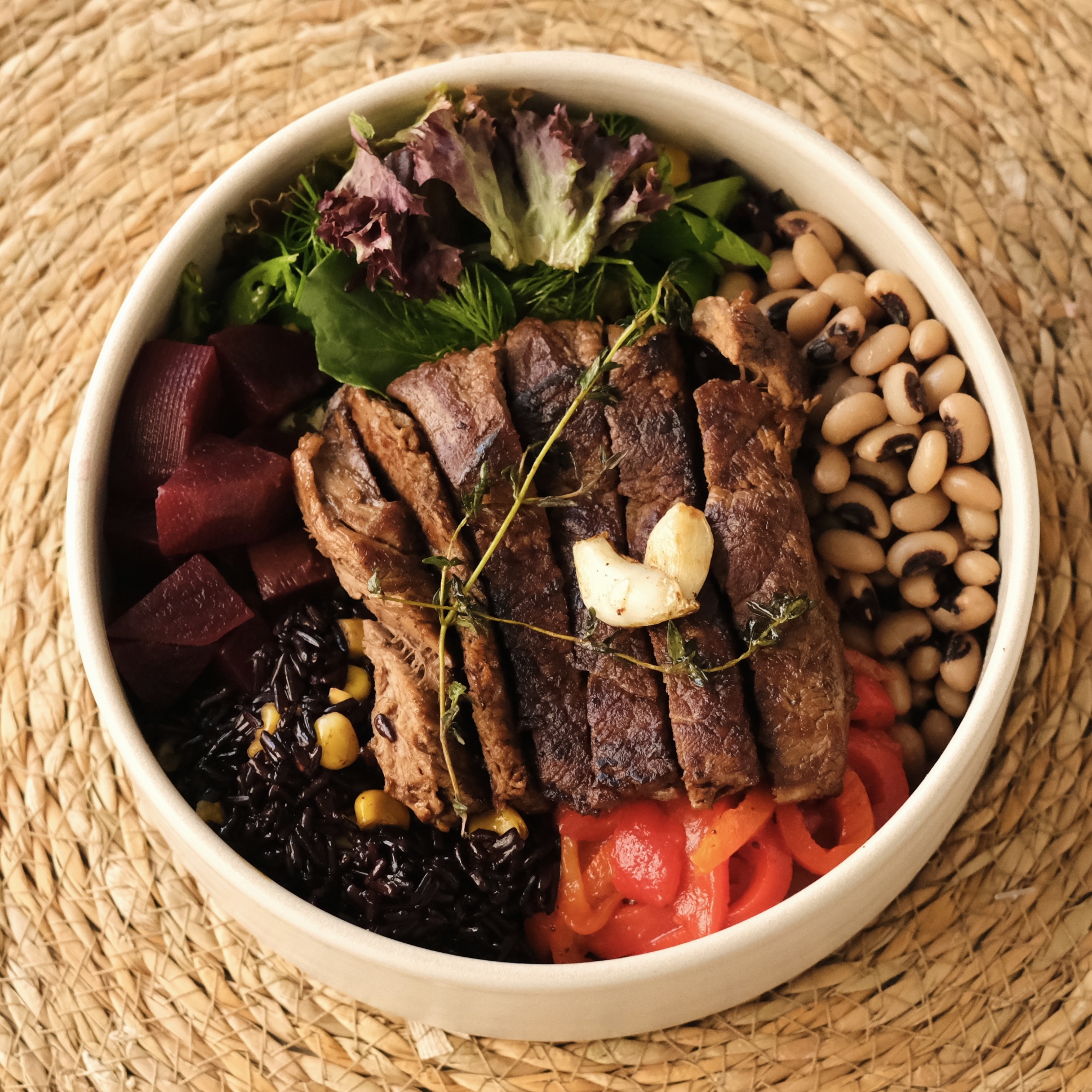 130 gr ızgara bonfile, kuru börülce, esmer pirinç, közlenmiş biber, haşlanmış pancar, mevsim salata