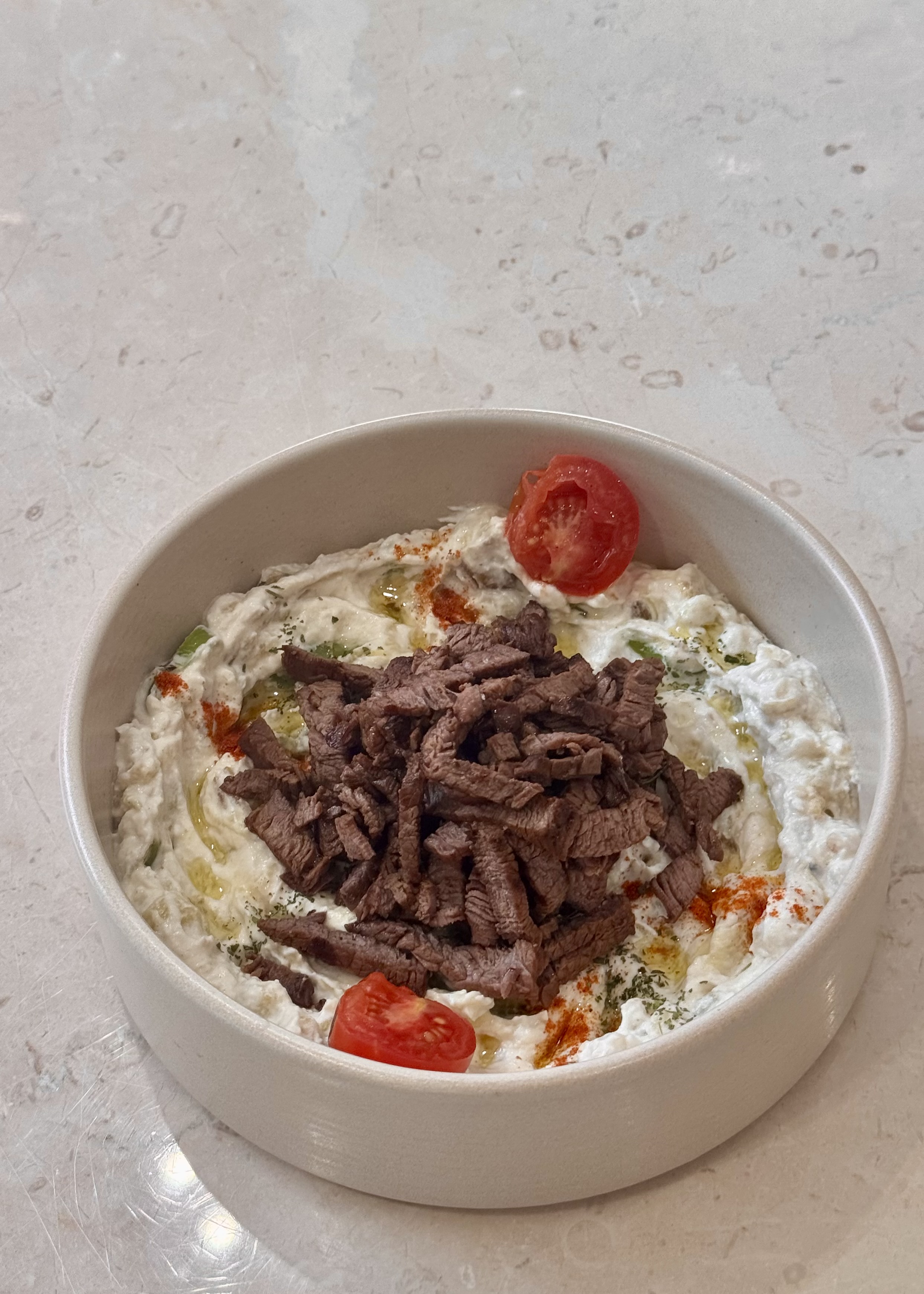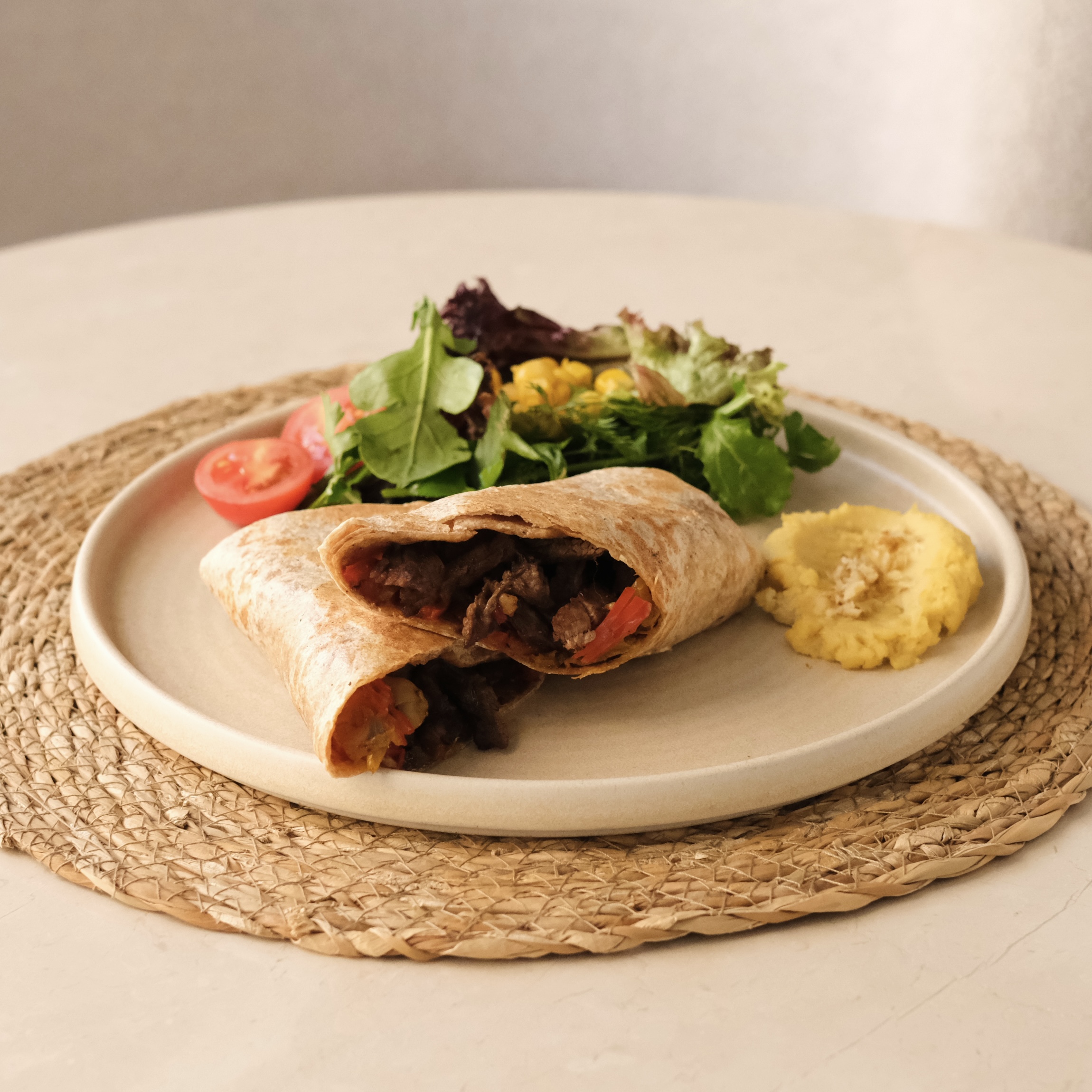 Jülyen doğranmış bonfile (100gr), sotelenmiş mantar, kapya ve yeşil biber, tam buğday lavaş, mevsim salata, humus