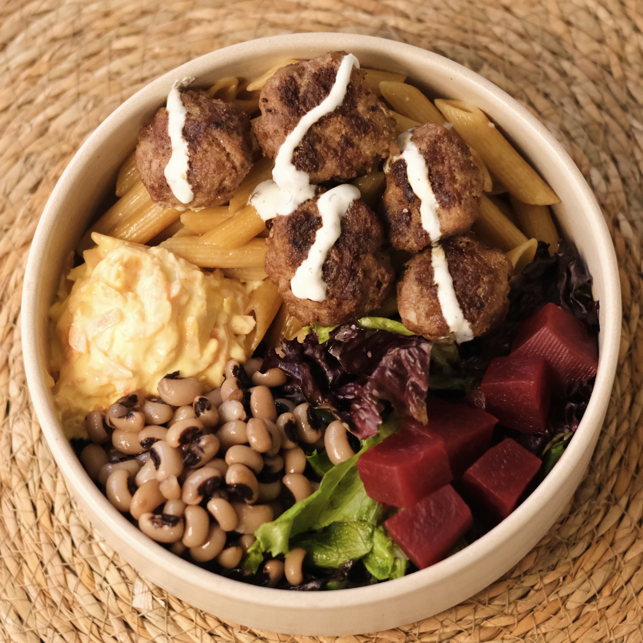 5 adet ızgara köfte (150gr), tam buğday makarna, haşlanmış pancar, kuru börülce, havuç tarator, mevsim salata