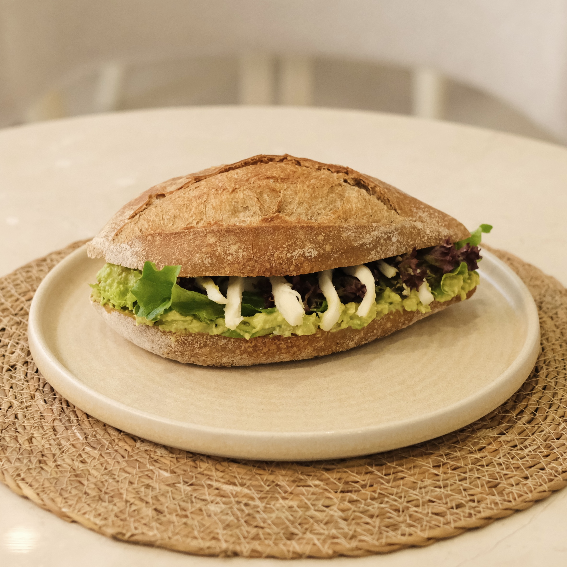 Ekşi mayalı baget ekmek,avokado ezmesi,tel peynir,salatalık,mevsim yeşilliği