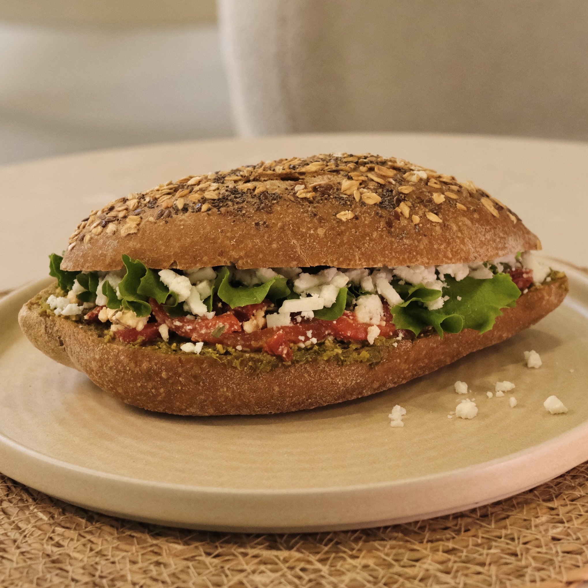 Ekşi mayalı baget ekmek,pesto sos,tulum peynir,kuru domates,köz biber,mevsim yeşilliği