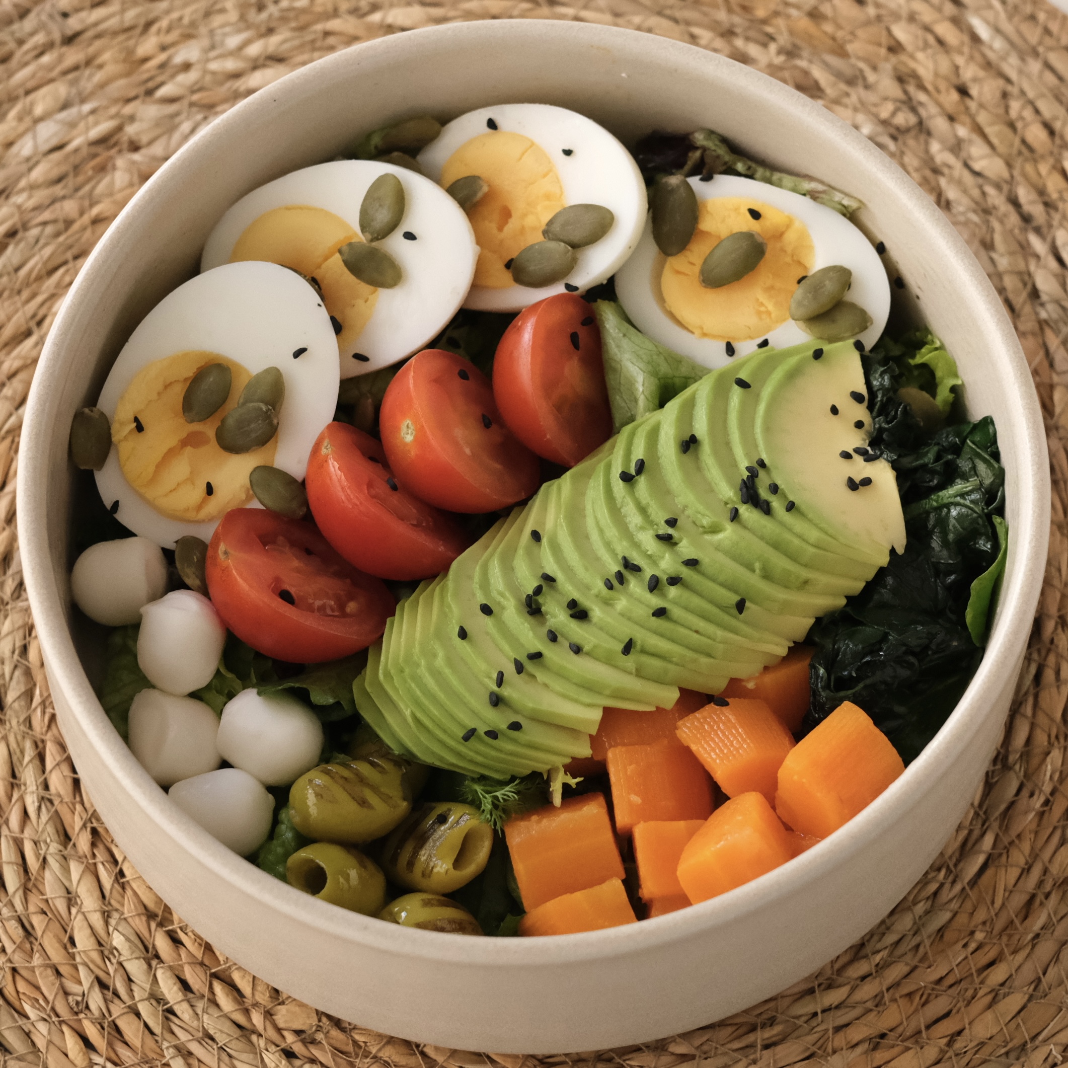 2 adet haşlanmış yumurta, mevsim salata, ıspanak sote, dilimlenmiş avokado, topi peynir, ızgara zeytin