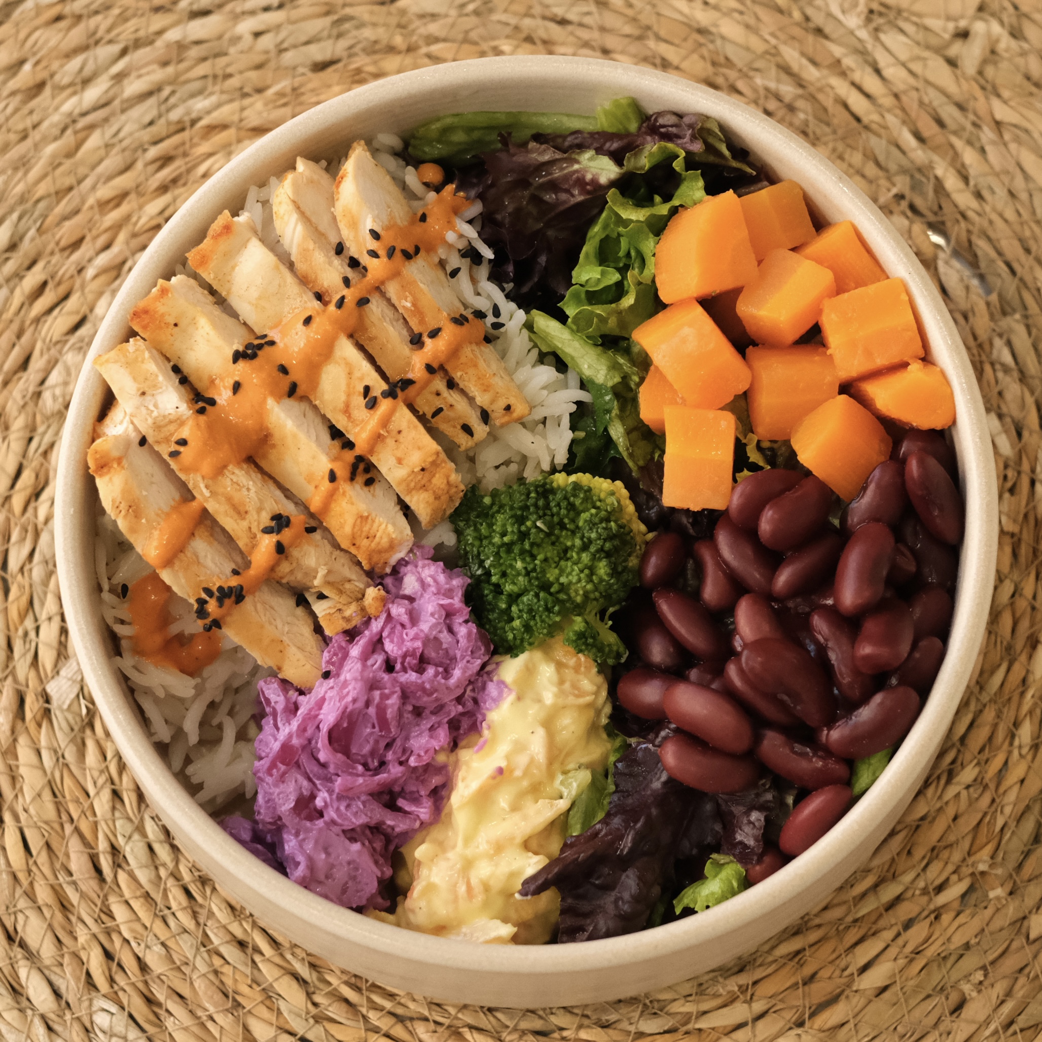 ızgara tavuk göğsü (130gr), basmati pirinç (100gr), meksika fasulyesi, fırınlanmış havuç, mor lahana mezesi, havuç tarator, mevsim salata