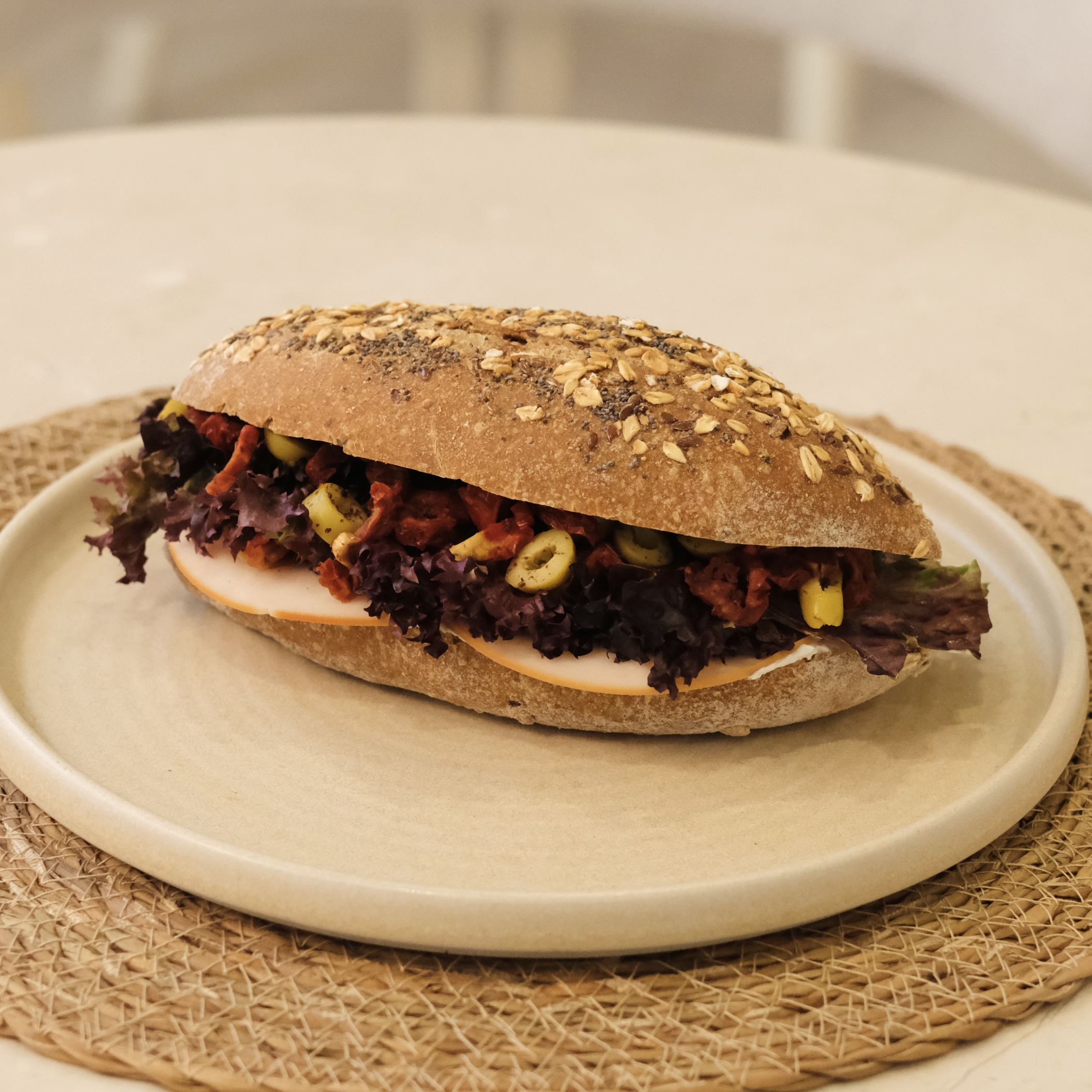 Ekşi mayalı baget ekmek,labne,hindi füme,kuru domates, dilimlenmiş yeşil zeytin,mevsim yeşilliği