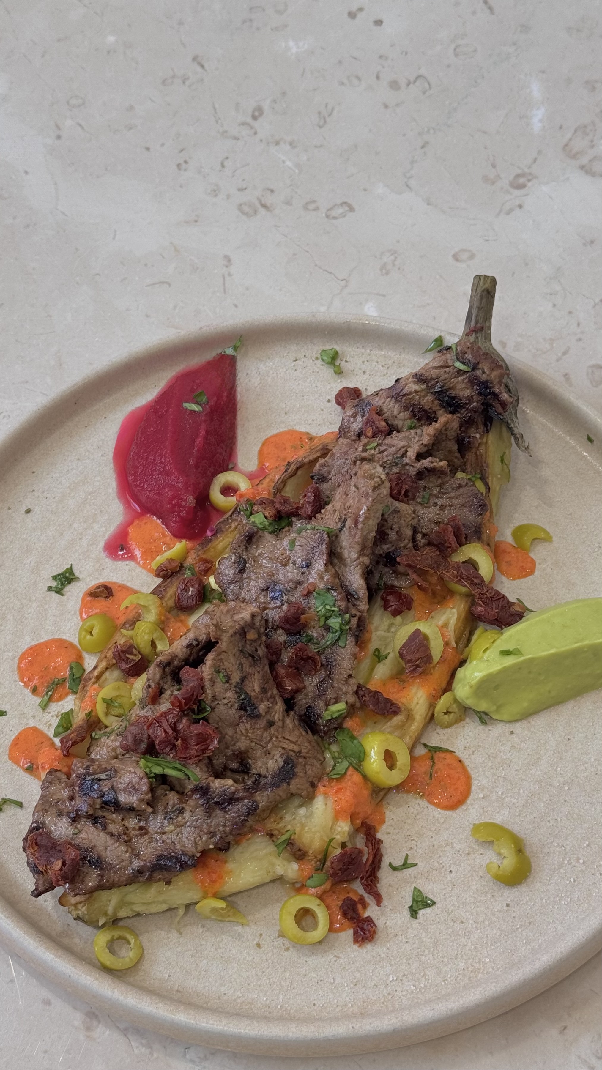 Közlenmiş patlıcan, dilimlenmiş zeytin, marine edilmiş bonfile dilimleri, avokado ezmesi, pancar püresi